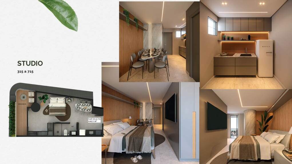 Apartamentos com 40,11m² possuindo espaço para um quarto, banheiro social e cozinha com área de serviço integrada e varanda em alguns flats.