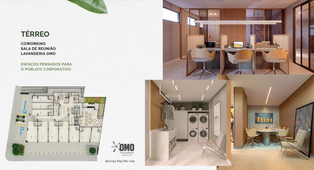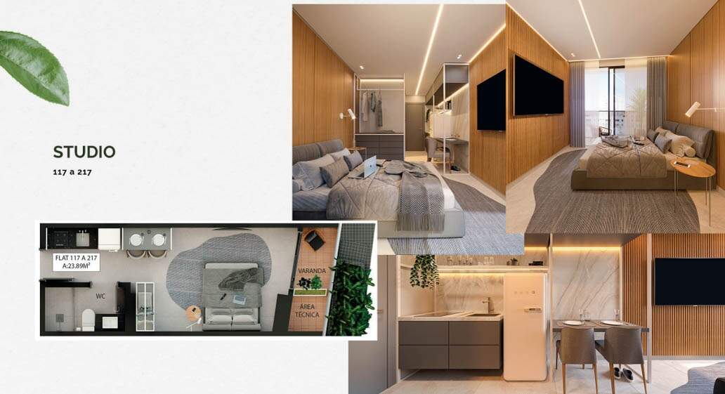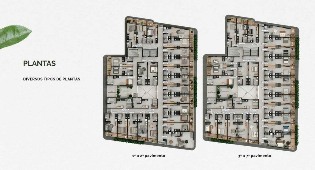 Com opções de plantas diferentes, sendo; Flats com 22,20m² possuindo espaço para um quarto, banheiro social e cozinha com área de serviço integrada e varanda em alguns flats.