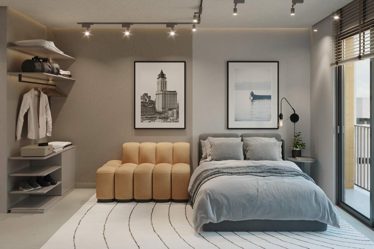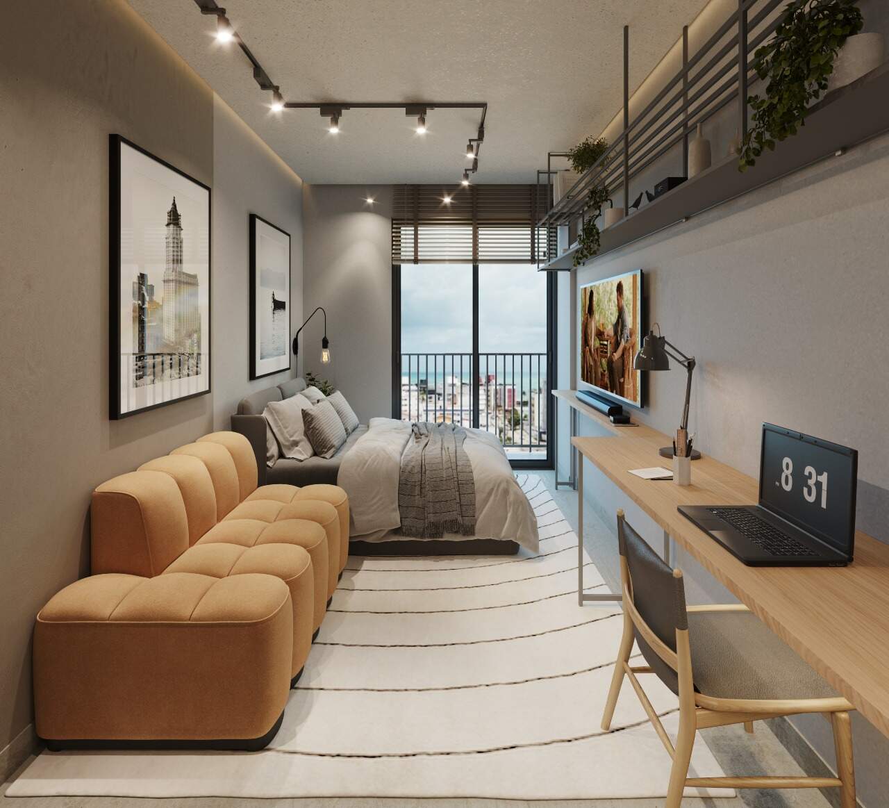 Flat composto por um quarto confortável, cozinha de apoio prática, banheiro social e uma varanda charmosa que traz leveza ao ambiente.