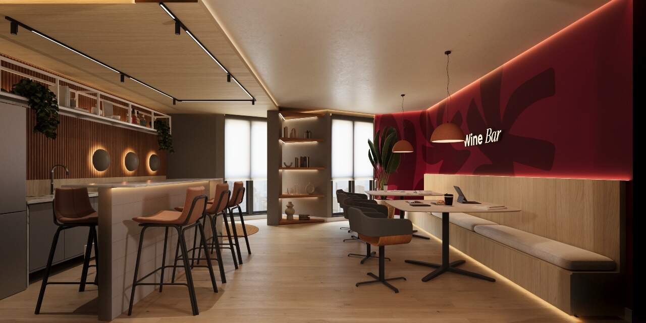 > Mini market, coworking, lavanderia, wine bar, pet place, bicicletario, academia e restaurante;