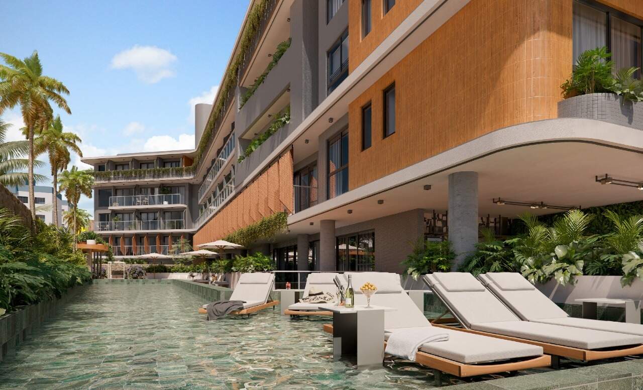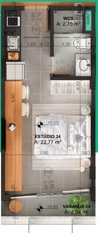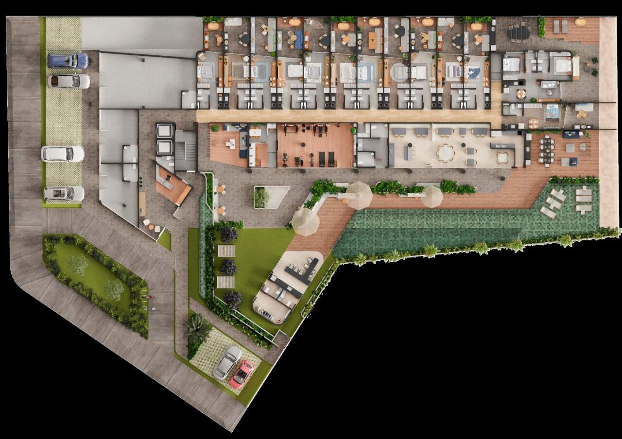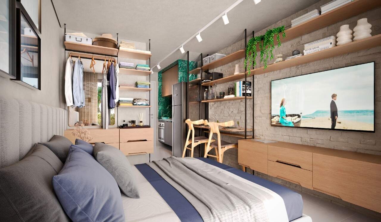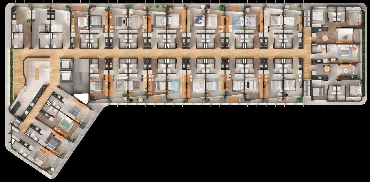 O empreendimento possui opções de planta entre 17m² a 143m², com 1 ou 2 quartos, sendo uma suíte, com sala, cozinha, varanda, área de serviço, elevador e uma vaga de garagem.
