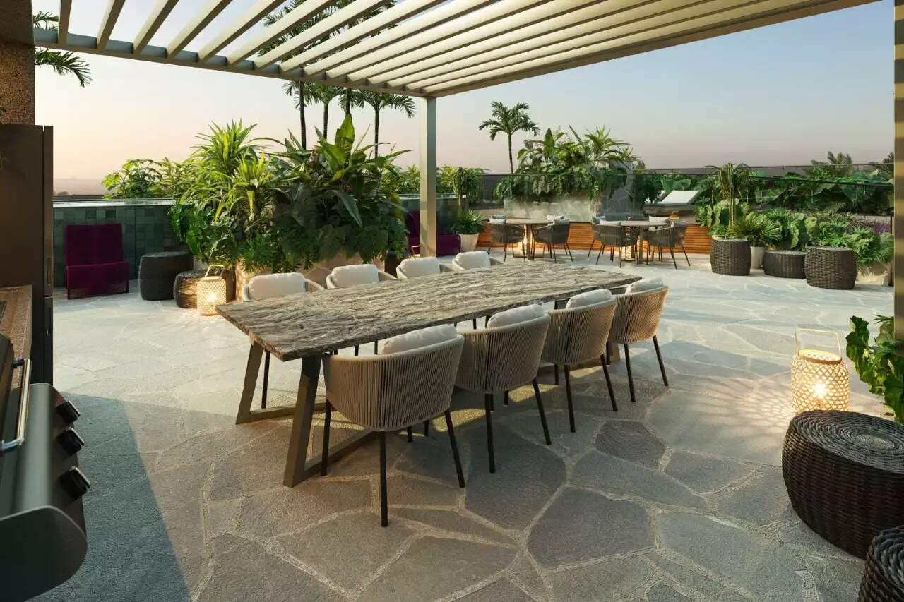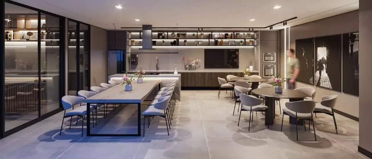 > Área de lazer com piscina, churrasqueira e espaço gourmet;