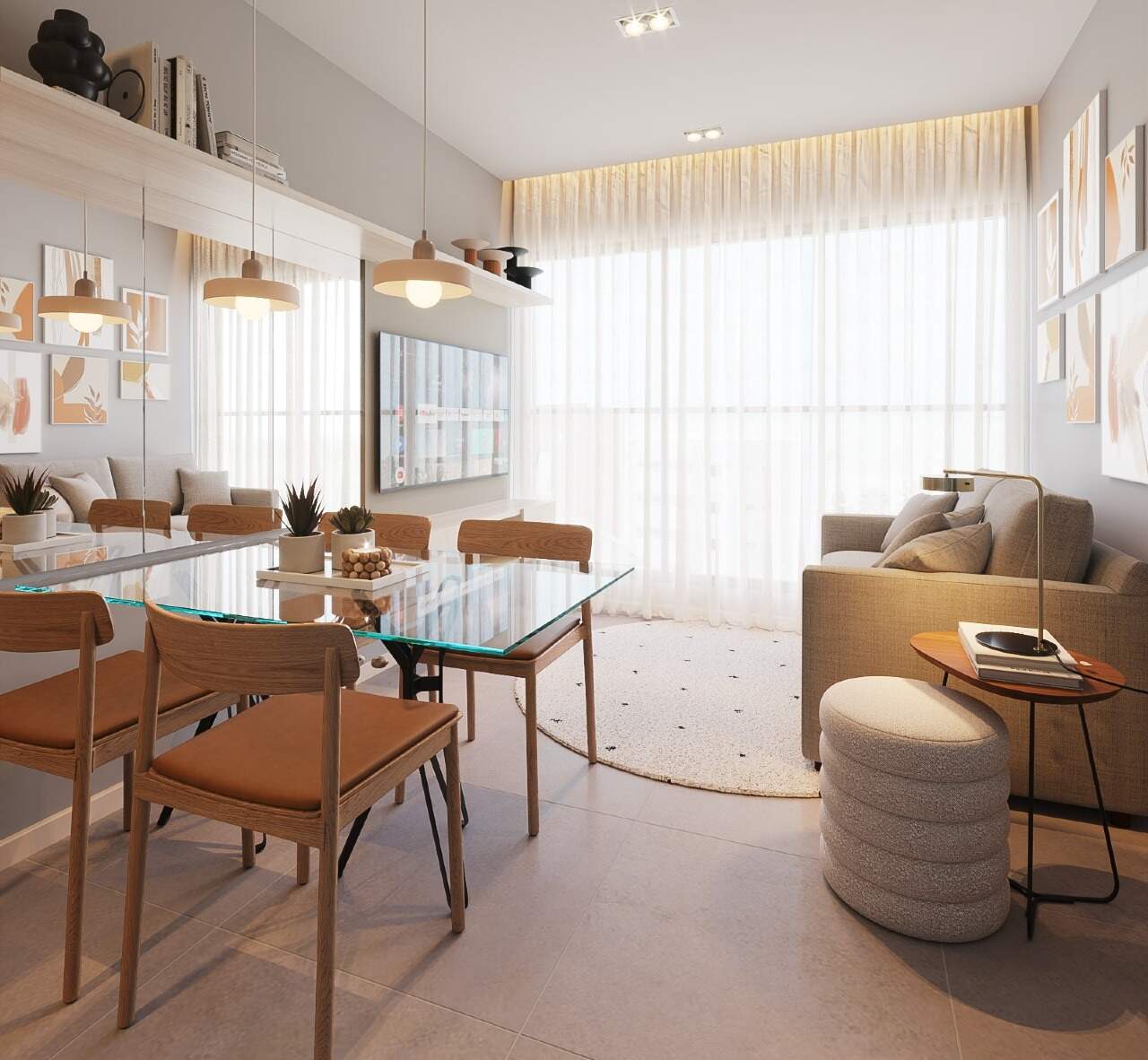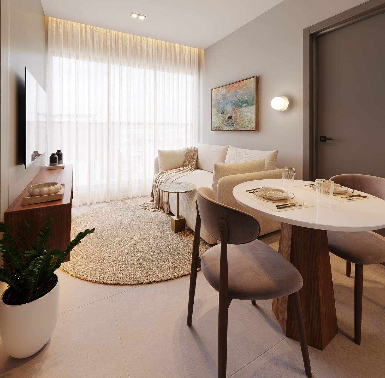 Apartamentos com 29m² a 30m² possuindo um quarto, sala de estar/jantar, banheiro socia e cozinha com área de serviço integrada.