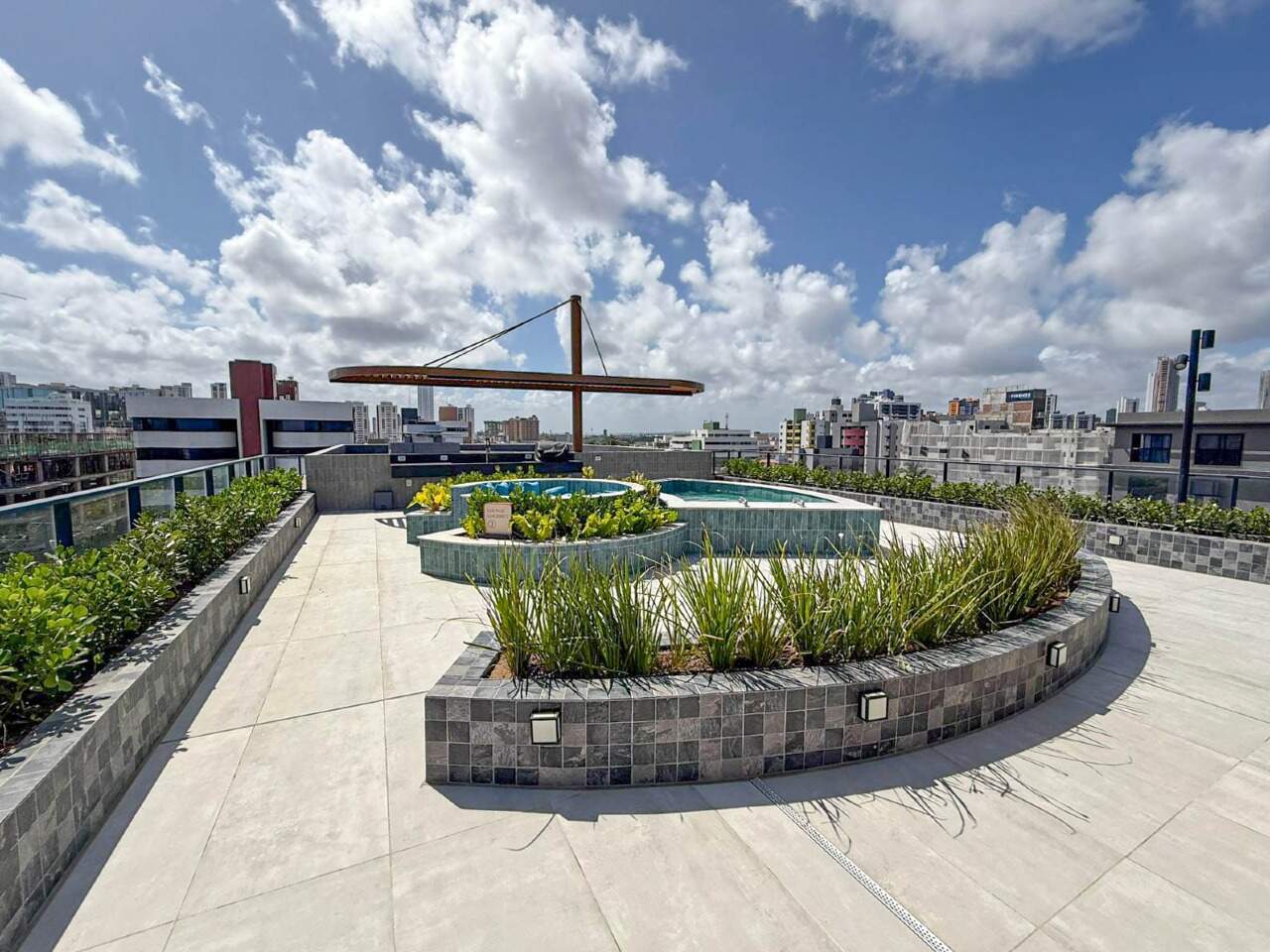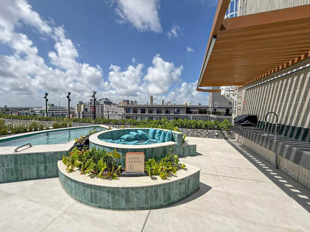 > Área de lazer com piscina, hidromassagem e espaço gourmet com churrasqueira;