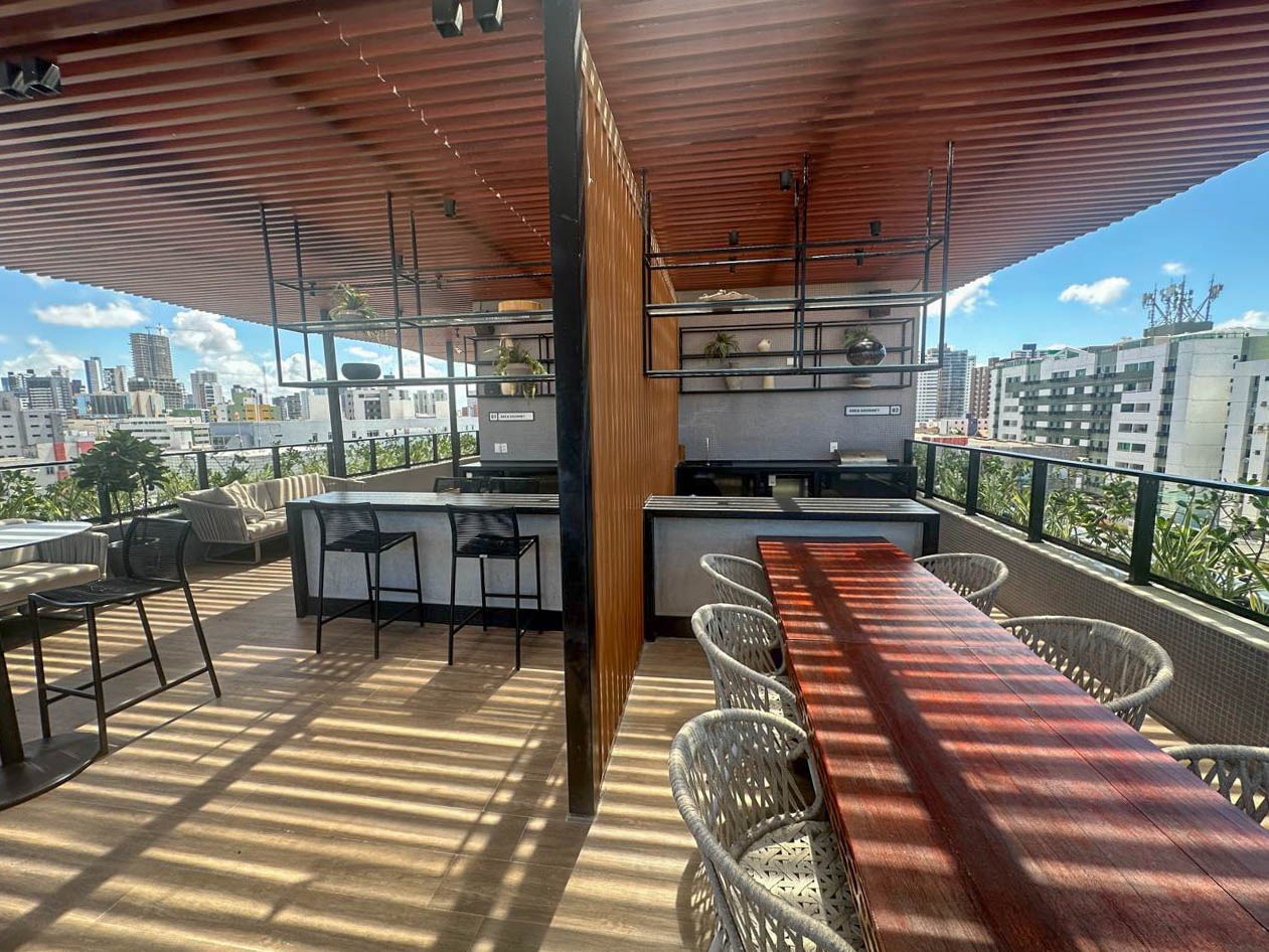 > Área de lazer com piscina, churrasqueira e espaço gourmet;