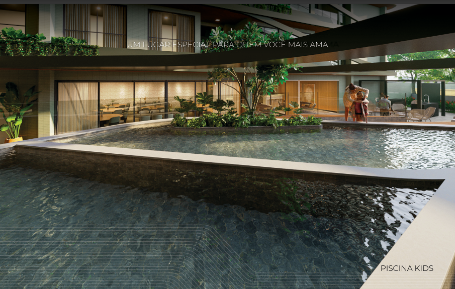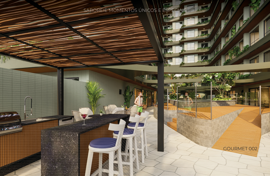 > Área de lazer com piscina, churrasqueira e espaço gourmet;