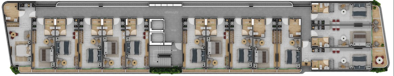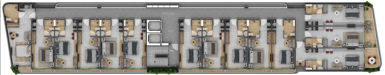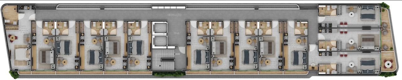 Plantas de 31m² a 40m² possuindo um quarto, banheiro, cozinha e área gourmet externa privativa.