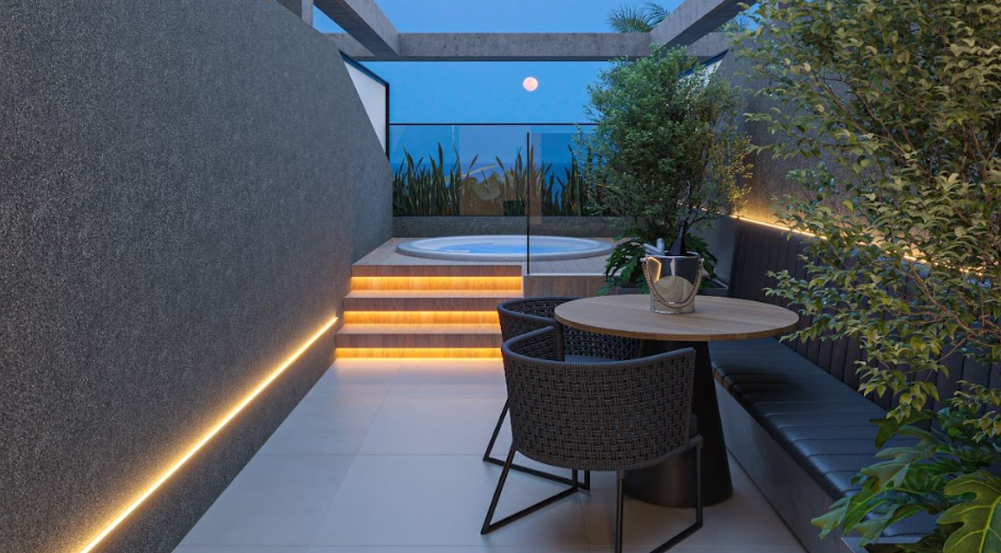 Plantas com 46m² Possuindo amplo espaço, cozinha, banheiro e área externa com hidromassagem.