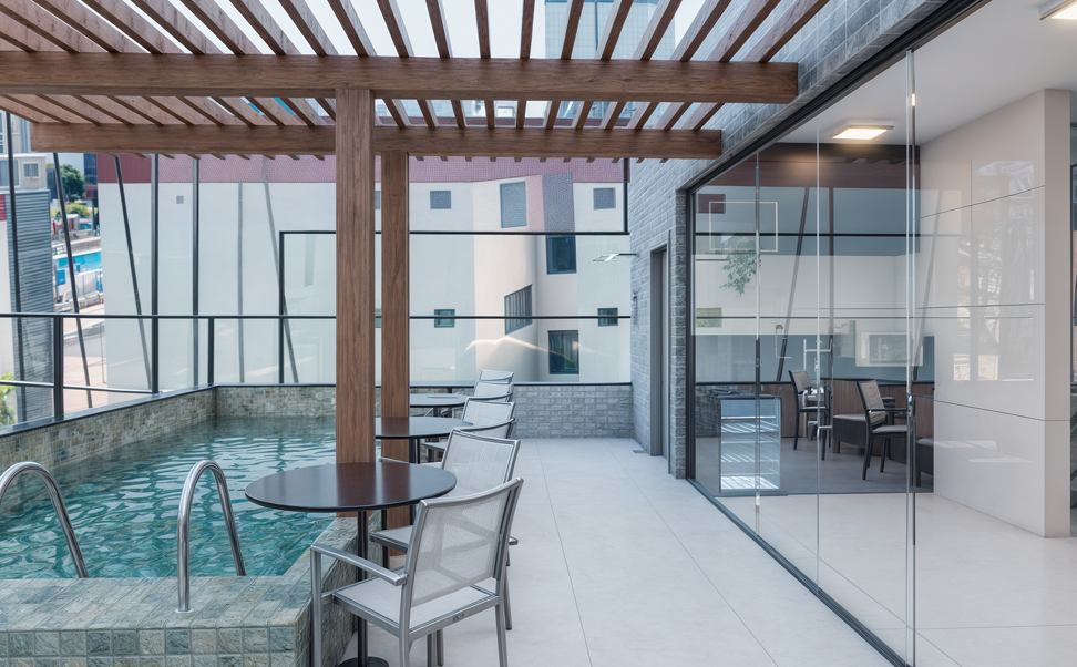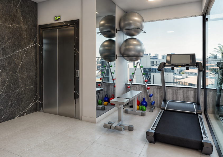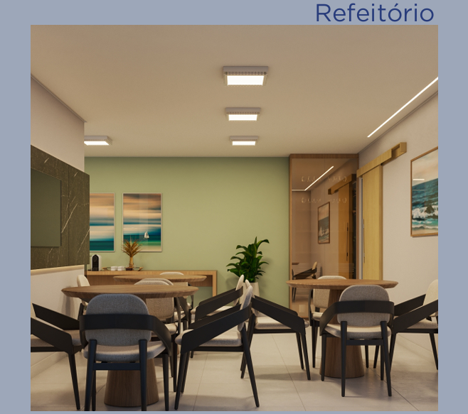 > Prédio com piscina, área gourmet, churrasqueira, espaço fitness, lavanderia, coworking, recepção, bicicletário e refeitório;