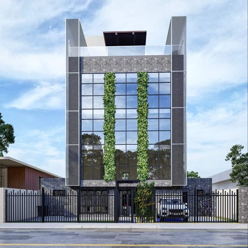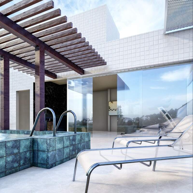Flats garden com 46,01m² a 51,51m² possuindo um quarto, banheiro social e cozinha de apoio e área externa com ofurô e pergolado.