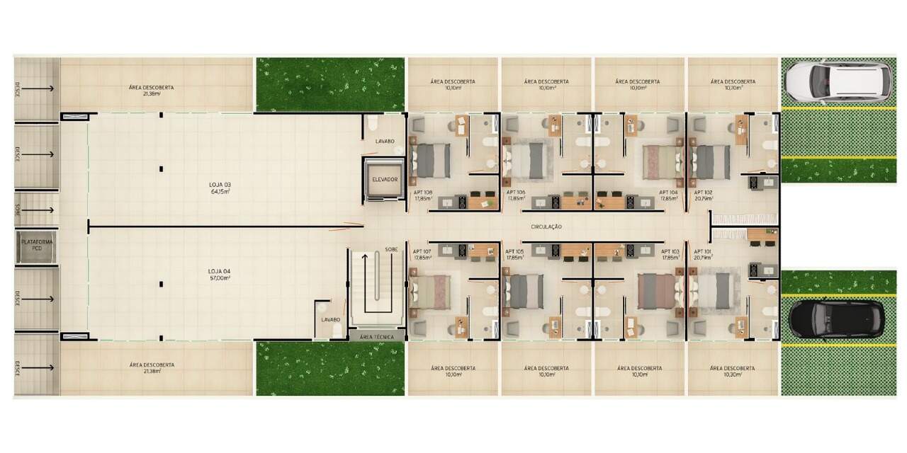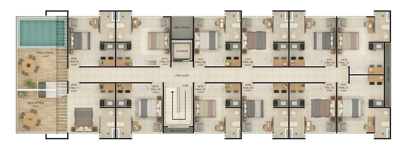 Com opções de plantas diferentes, sendo; Flats com 18,55m² possuindo um quarto, banheiro social e balcão de apoio.