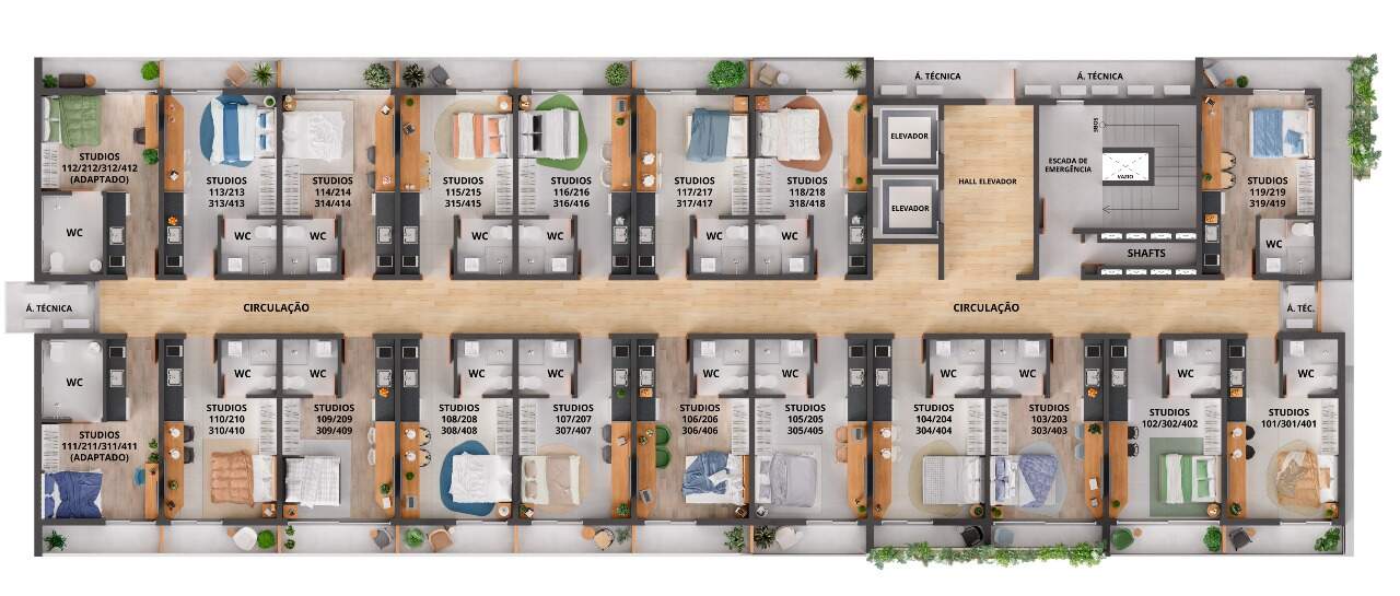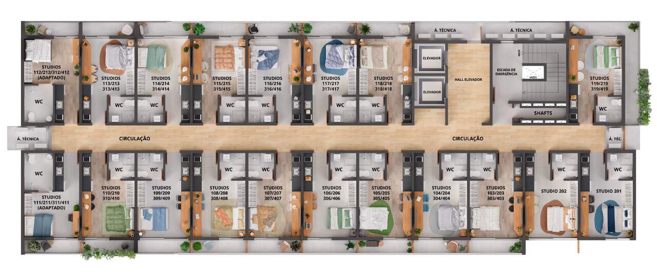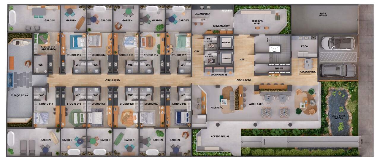 As plantas disponíveis são de Studios com áreas entre 19,26m² e 46,68m², podendo ser Studios Garden com área externa.