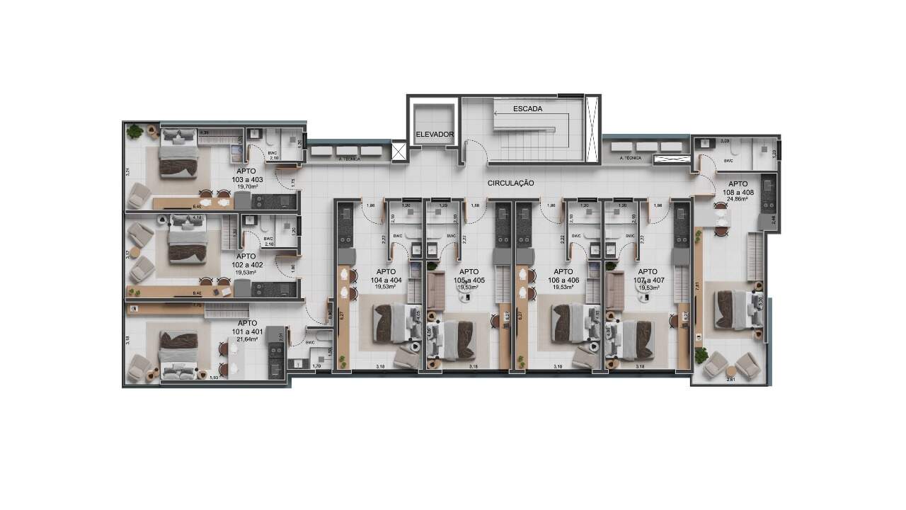 Flats com 21,80m² cozinha de apoio e banheiro;