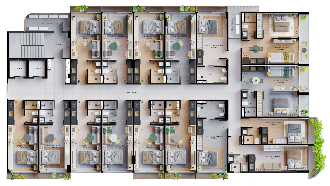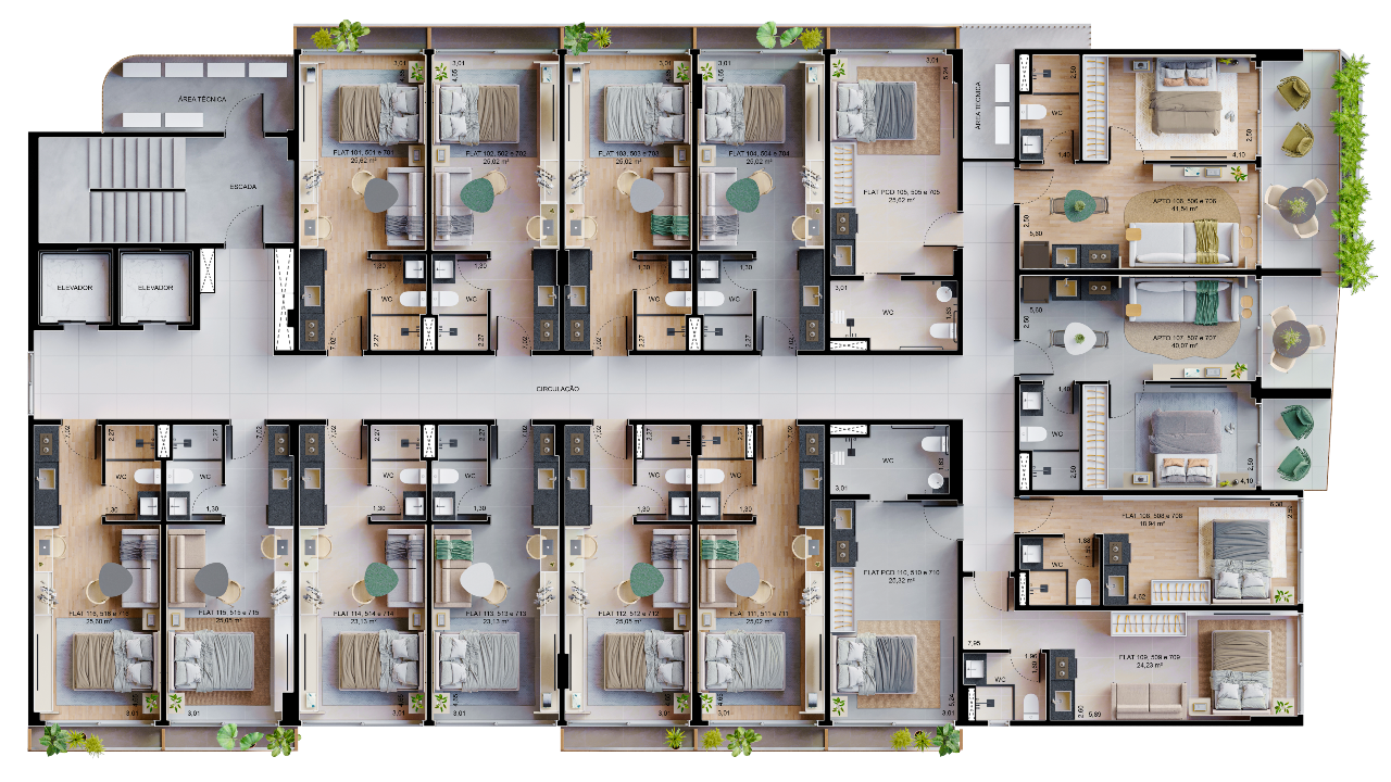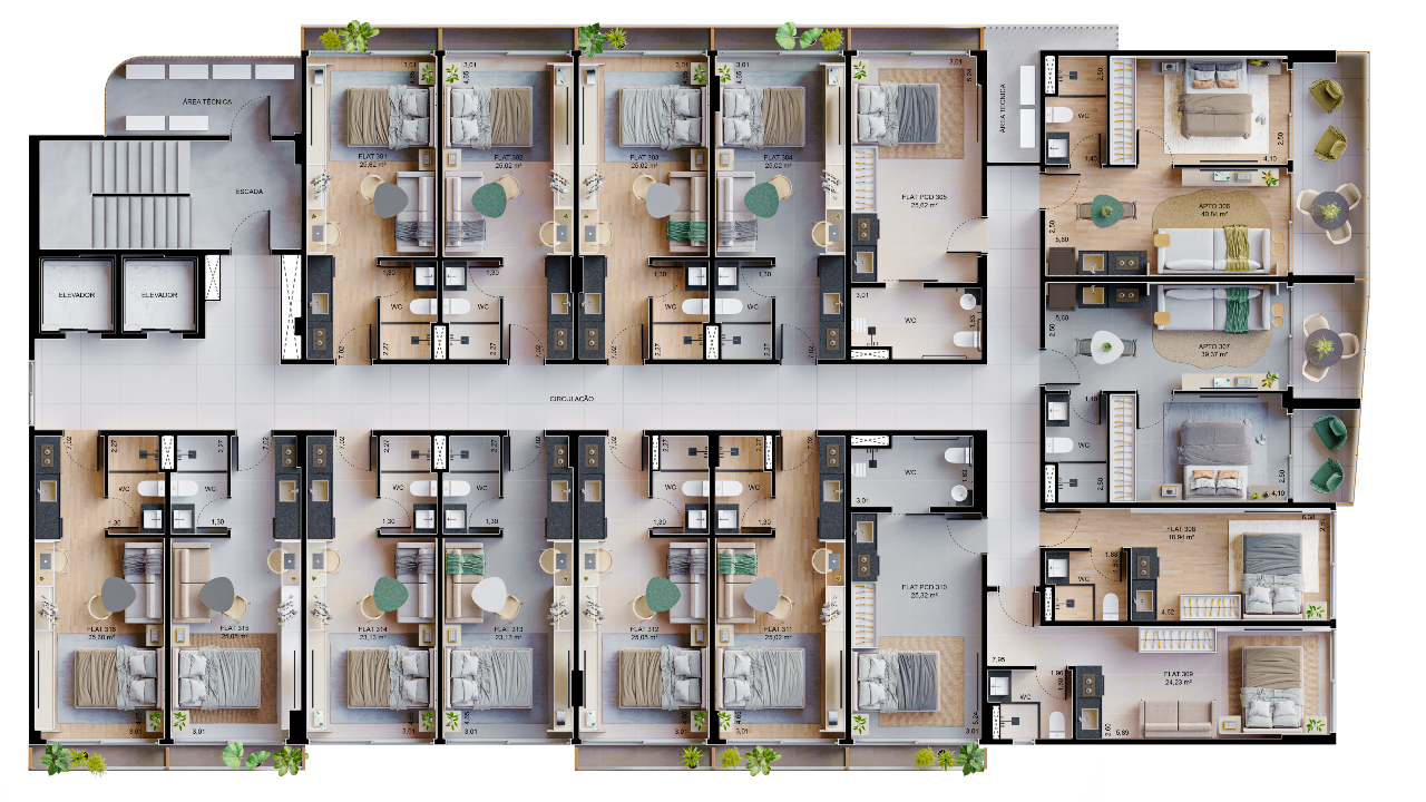 Com opções de plantas diferentes, sendo; Flats com 18,94m² a 25,62m² possuindo banheiro social e cozinha de apoio.