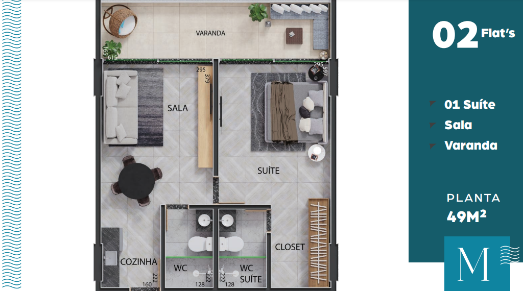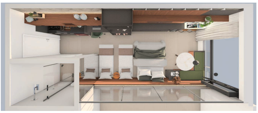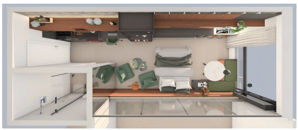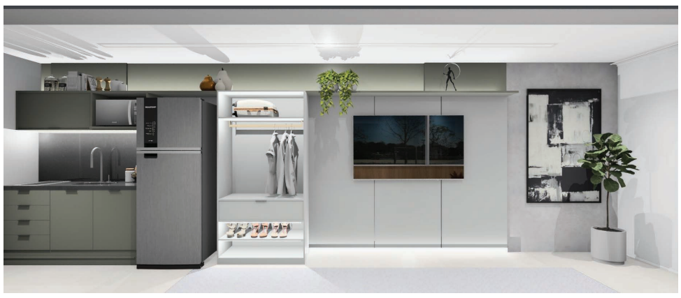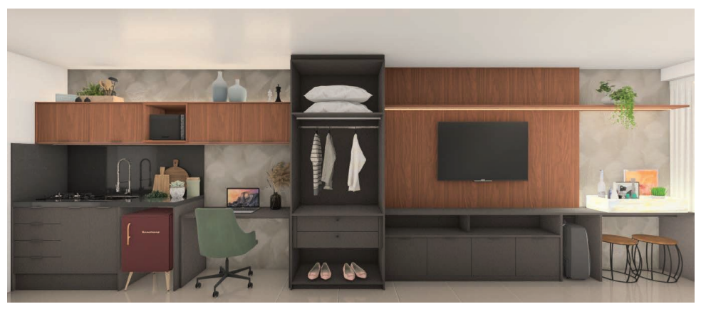 Flats com 24m² a 27m² possuindo espaço para quarto, banheiro, cozinha de apoio e varanda.