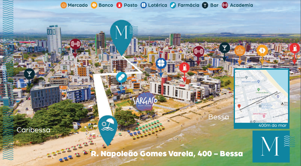 Situado no Bessa, próximo a academias, Padarias, Colégios, Mercados, Restaurante e bares, farmácias, postos de gasolina, lotéricas e apenas a 400m da praia.