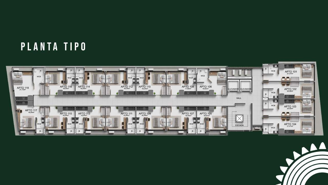 Nos demais pavimentos, 1º a 7º andar, dispõe de opções de Flats com metragens entre 18m² e 21m².